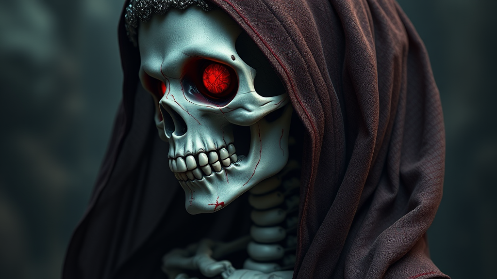 A mesmerizing skeleton woman draped in regal attire, embodying the queen of the underworld. Her eye area is vividly colored, contrasting with her hollow eyes, which hint at both the ethereal and the morbid. Veins and traces of blood intricately wind across her form in a dance of life and death. Posed sideway, she embodies the essence of the living dead with an unholy allure. Infused with fantasy elements, the scene is extremely intricate, hyper-realistic, and bursting with cinematic detail. The image captures absurd resolution in 4k, 8k UHD, and HDR, reminiscent of an octane render. A haunting yet captivating portrait that tantalizes the realms of the unreal.