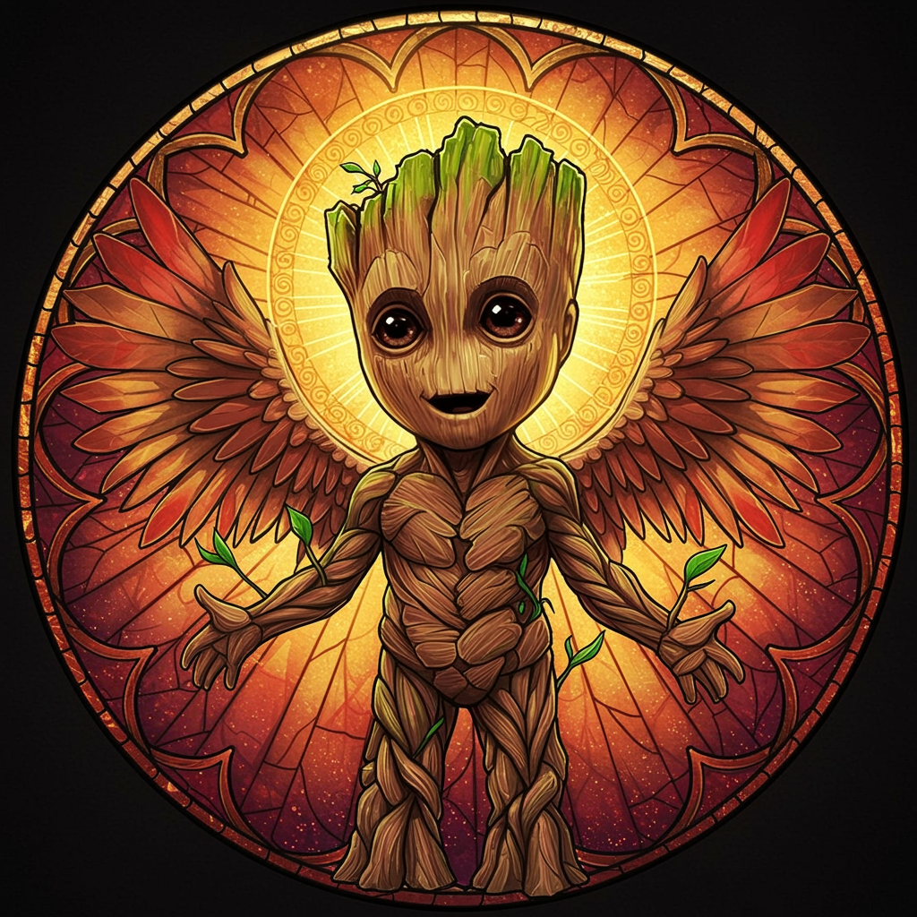 A mesmerizing stained glass depiction of Baby Groot, intricately crafted with vibrant colors and a radiant glow, reminiscent of a sacred icon. This highly detailed artwork captures the essence of a Gothic cathedral window, with an ethereal backlit effect that brings the piece to life. The design is inspired by the visionary styles of Clive Barker, H.R. Giger, and Brom, combining elements of the surreal and the mystical. Trending on Artstation, this concept art digital painting showcases a captivating fusion of the fantastical and the divine, celebrating the enchanting nature of Baby Groot in an awe-inspiring and celestial form.
