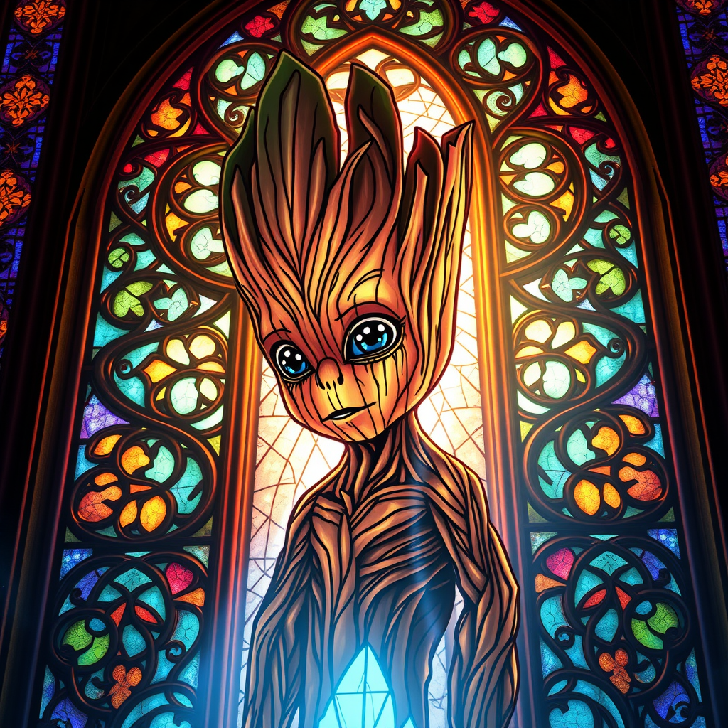 A mesmerizing stained glass window depicting baby Groot, designed with intricate and colorful patterns, glowing with a divine luminosity. This radiant piece captures a religious aura, echoing the grandeur of Gothic cathedral artistry. The highly detailed design is backlit, emitting a celestial glow that brings the scene to life. The concept art, trending on Artstation, blends digital painting with the distinctive styles of Clive Barker, H.R. Giger, and Brom, creating a unique, ethereal masterpiece that harmonizes between the realms of the fantastical and the sacred.