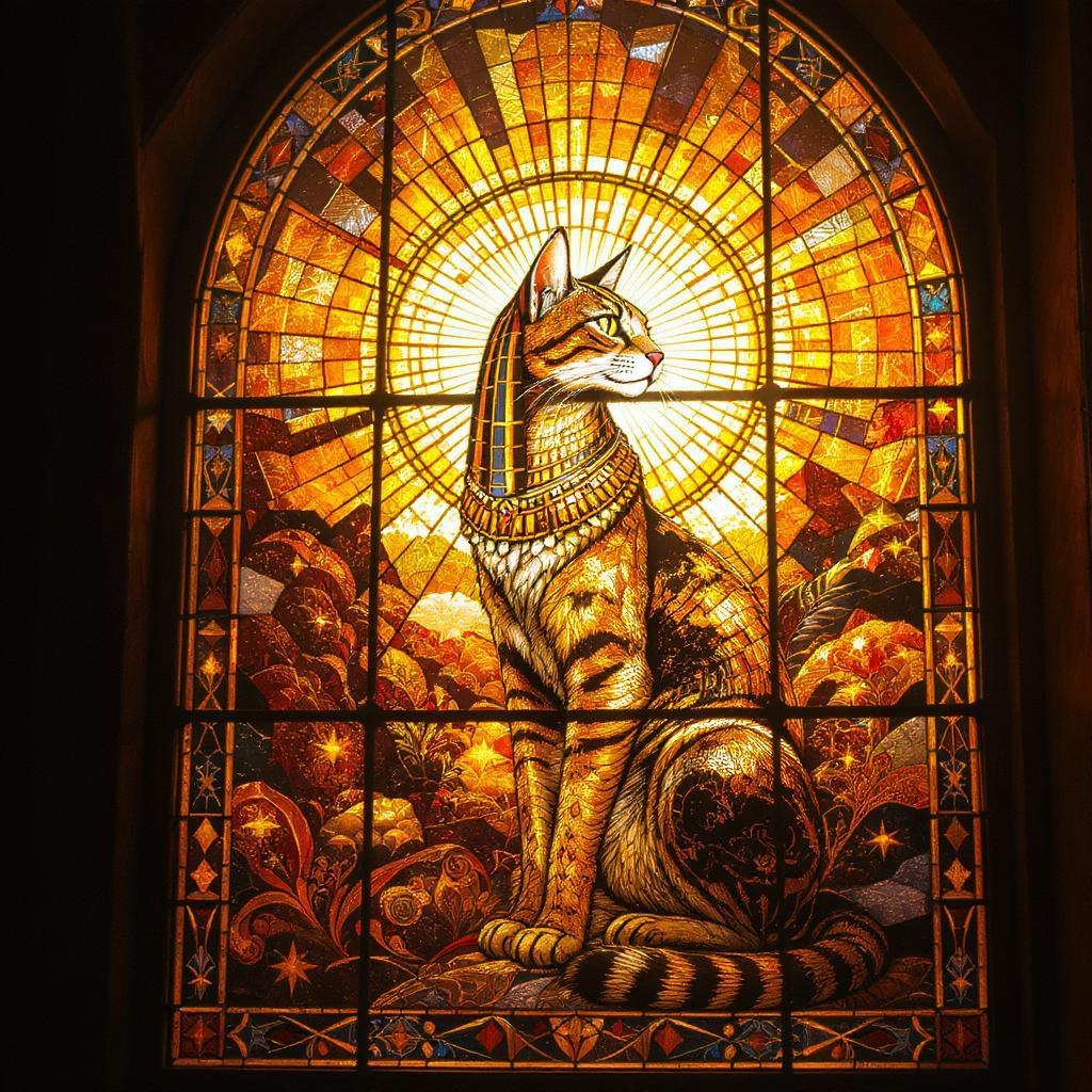A mesmerizing stained glass window featuring a regal Egyptian cat, its elegant form posed gracefully to the side. The sun radiates behind its head, casting a divine halo. Imbued with intricate patterns, each glass piece captures the feline's sleek fur and sharp features in high definition. The scene is illuminated with softbox lighting, illuminating extreme details in vivid hues as light pours through. The window's ethereal beauty is heightened by delicate touches of gold leaf that accentuate the cat's noble bearing, creating a harmonious blend of artistry and sophistication.