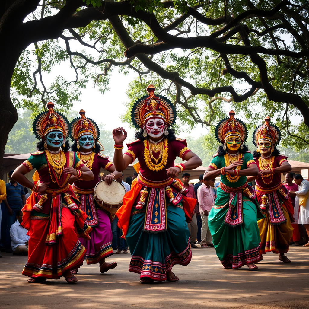 A mesmerizing traditional dance from the vibrant culture of Kerala, where performers adorned in elaborate, colorful costumes and intricate face paint transform into divine beings, bringing ancient myths and folklore to life with hypnotic movements and rhythmic drumming under the canopy of ancient temple trees.