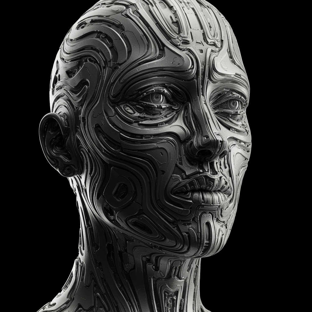 A mesmerizing, ultra-high-definition close-up of a humanoid face crafted from polished, reflective metal. The surface is intricately twisted and distorted into abstract, surreal shapes, merging seamlessly with organic features to evoke a futuristic hybridity. The cold, chrome-like texture captures light, creating a monochromatic play of shadows and highlights. The rich detail showcases minute imperfections and reflections, emphasizing the intersection of machine and organic elements within this captivating visage. The tall, narrow aspect ratio enhances the elongated elegance of this otherworldly creation.