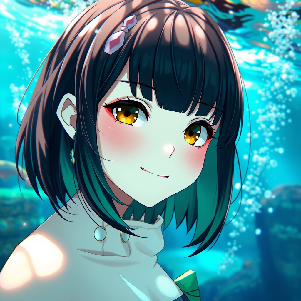 A mesmerizing underwater fantasy scene with a solo female character featuring two-tone hair in shades of black and green. Her shoulder-length straight hair, complete with blunt bangs, elegantly frames her face. Some strands tuck behind her ear, revealing yellow eyes highlighted by black eyeshadow and eyeliner. Her cheeks have a subtle blush, and she displays a shy smile with naturally colored, normal lips. The intricate detail of mermaid scales adds a mystical touch to her forehead and cheeks, and she wears tasteful jewelry, including a piece on her forehead. She tilts her head cutely, creating a happy expression as she looks directly at the viewer, conveying a sense of connection. This scene captures the vibrant and beautiful essence of an underwater environment, appearing like a cinematic, high-resolution shot with extreme detail. The setting is immersive and visually striking, evoking an enchanting fantasy beneath the sea's surface.
