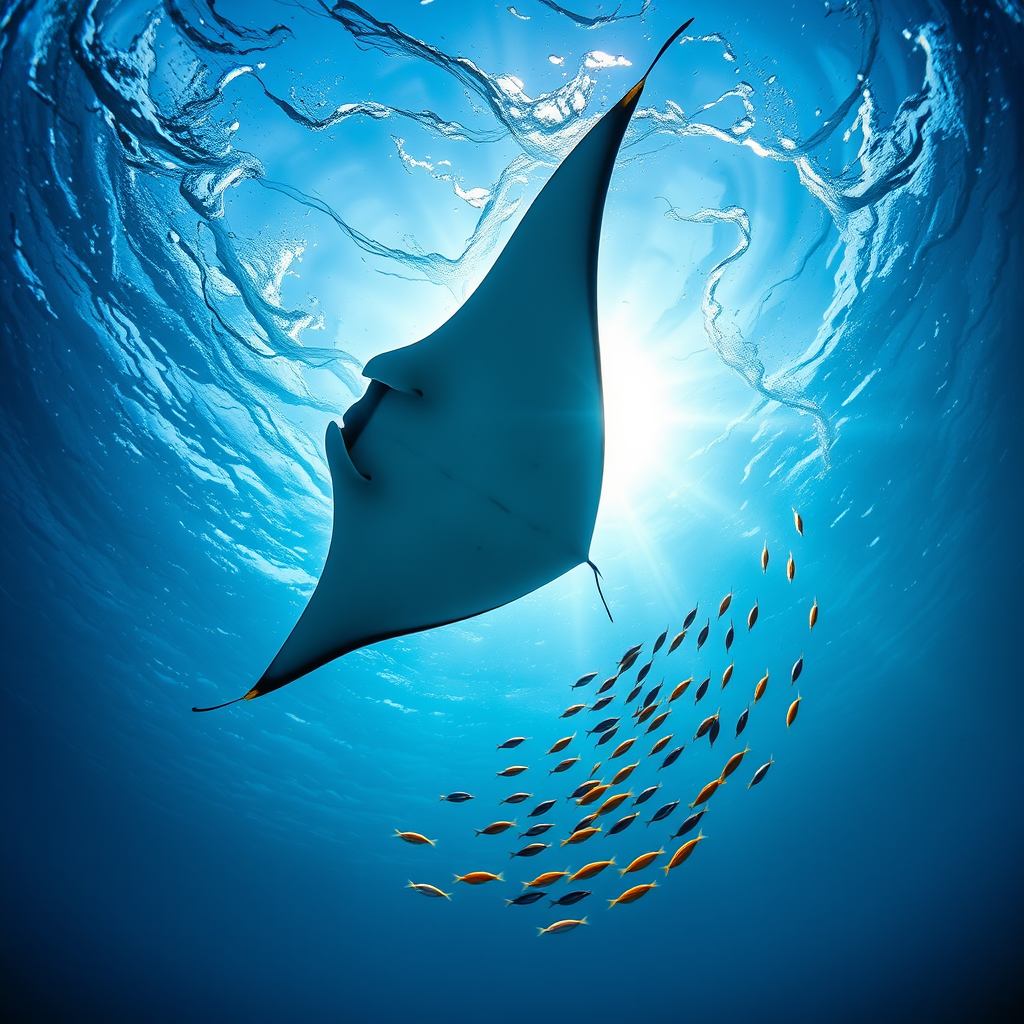 A mesmerizing underwater image showcasing the fluid dance of a stunning manta ray as it effortlessly navigates the pristine, azure depths of the ocean. The manta ray is accompanied by a school of vibrant fish, their iridescent scales contrasting beautifully with the manta's elegant silhouette against the sun-dappled water. This captivating scene is captured from a unique perspective below, emphasizing the majestic creature's grand wingspan framed by the ethereal glow of sunlight filtering through the rippling surface. The photograph expertly plays with the interplay of light and shadow to accentuate the intricate markings on the manta rayβs wings and the dynamic movement of the tiny followers in its slipstream. Shot with state-of-the-art underwater equipment, the image offers a glimpse into the enchanting aquatic world, capturing its allure and mystique in hyper-realistic detail, ultra high-definition, HDR, with an aspect ratio of 4:3 and a quality setting of 2.