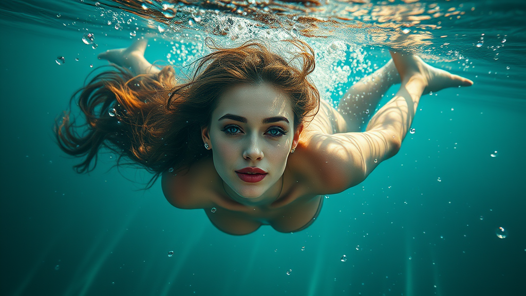 A mesmerizing underwater photograph features a woman swimming gracefully, surrounded by delicate water bubbles catching sunlight, with realistic shadows enhancing the scene. Her symmetrical face and relaxed expression add serenity. The water is remarkably clear, with a slight murkiness, while the play of light imparts a mystical atmosphere. Captured with a DSLR and a 35mm f/2.8 lens, this off-centre composition is both charming and memorable, with a cinematic, hyper-realistic aesthetic. Her shimmering jewellery and elegant heels add an unexpected touch to the underwater setting, accentuated by bright, almost blinding light. Riveting symmetry and refined details create an enchanting visual, avoiding elements like deformities and poorly drawn features, ensuring an artistic, high-quality capture.