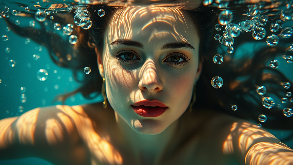 A mesmerizing underwater photograph of a woman swimming gracefully, surrounded by shimmering water bubbles reflecting the sunlight. The image is ultra-detailed with realistic shadows and a symmetrical face that exudes a relaxed expression. The water appears clear, with a slight hint of murkiness, while the interplay of light creates a mystical atmosphere. Captured with a DSLR using a 35mm f/2.8 lens, the composition is off-center, delivering a charming and memorable cinematic feel. Featuring hyper-realistic, high-resolution detail, the scene includes elegant jewelry and adds artistic flair with elements like bright, almost blinding light and creative expression. The atmosphere is enchanting and visually striking, conveying elegance and beauty while maintaining clarity and focus on the subject within the captivating aquatic environment.