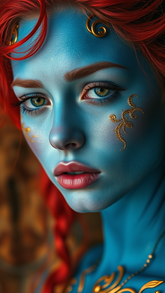 A mesmerizing woman adorned in blue paint with vibrant red hair, depicted in a hyperrealistic portrayal reminiscent of marine life, entwined with hues of dark gold and shimmering gold, exuding a haunting yet enchanting beauty. Her distinct facial features are serene and captivating, set against a backdrop of rich oranges and golden tones, creating an evocative and fantasy-inspired masterpiece.