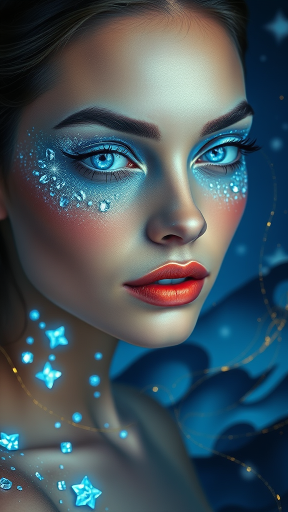 A mesmerizing woman adorned with luminous blue crystal makeup, the crystals sparkle like precious gems in her eyes, casting light in dazzling facets, while others surround her like drifting stars. Her skin emits an ethereal radiance, reminiscent of moonlight on a clear night. The background is an abstract landscape in deep blue tones, with fluid shapes and subtle golden details that dance like threads of gold amid gentle shadows. The high-resolution photograph captures intricate details in the textures of the crystals and skin, with soft lighting that enhances delicacy, in a hyper-realistic style that blends natural beauty with enchanting surrealism.