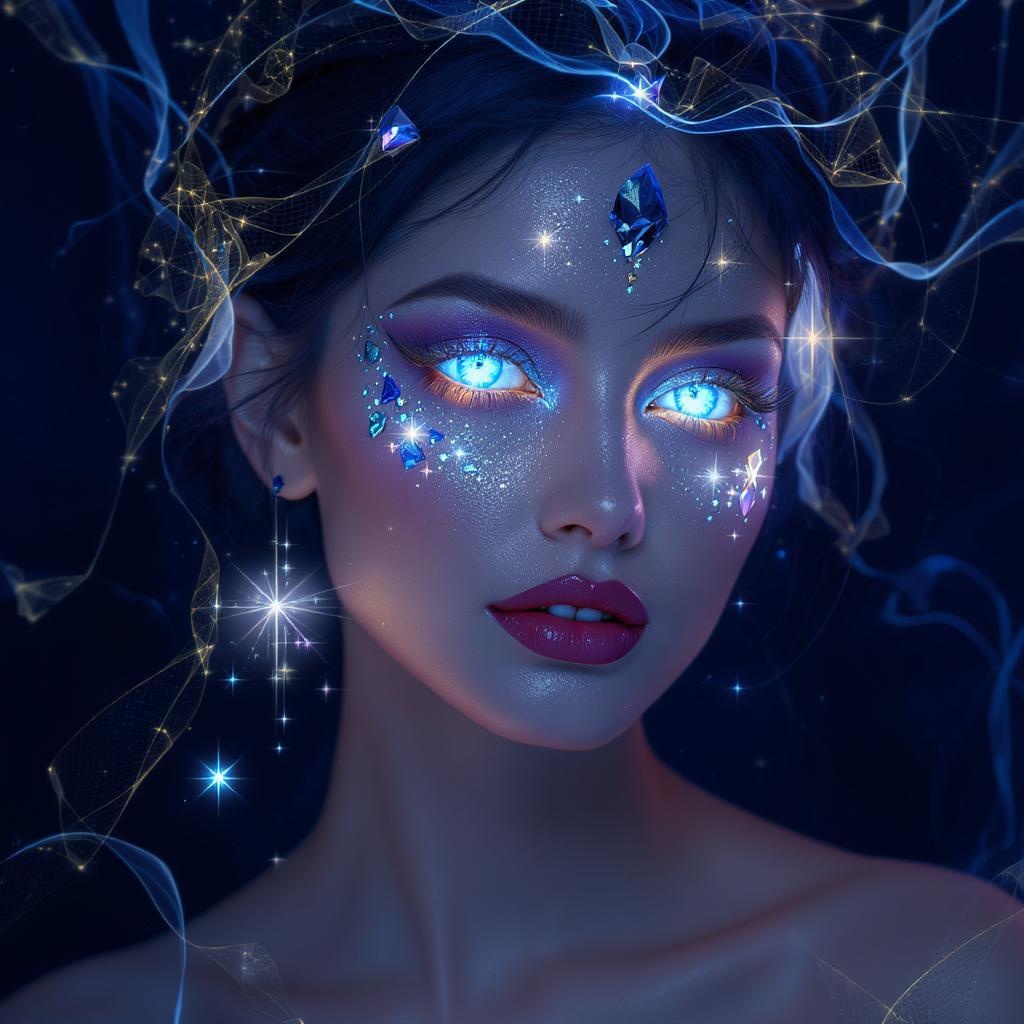 A mesmerizing woman adorned with makeup of sapphire crystals, these gems shimmer like precious stones in her eyes, reflecting light in dazzling facets, while others float around her like ethereal stars. Her skin exudes a soft, otherworldly glow reminiscent of moonlight on a clear night. The background is an abstract setting in deep shades of blue, intertwined with subtle golden accents that dance like filigree threads among gentle shadows. High-resolution photography captures intricate details in the textures of the crystals and her skin, with soft lighting enhancing the delicacy, blending natural beauty with enchanting surrealism in a hyper-realistic style.