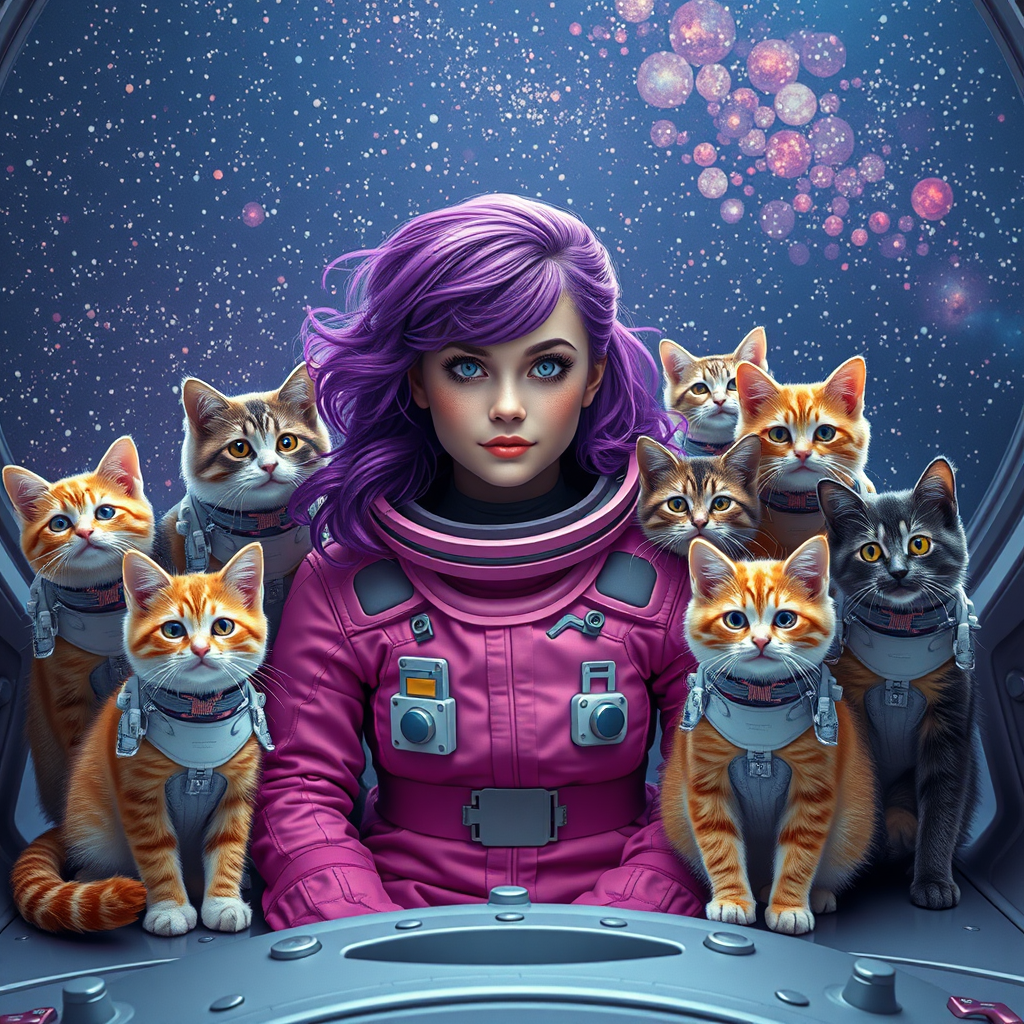 A mesmerizing young woman with vibrant purple hair is surrounded by cats of all colors and sizes on a sleek, modern space station. She's dressed in a playful pink and purple space suit, while the cats are donned in charming astronaut outfits. The backdrop showcases the vastness of space, speckled with countless shimmering stars and distant galaxies. Mechanical components of the station add a touch of futuristic elegance to the scene. Together, the girl and her feline companions are on a whimsical journey through space, captured in stunning 8k detail with radiant, cinematic lighting reminiscent of Fuji color film, creating a captivating and imaginative vision of exploration.