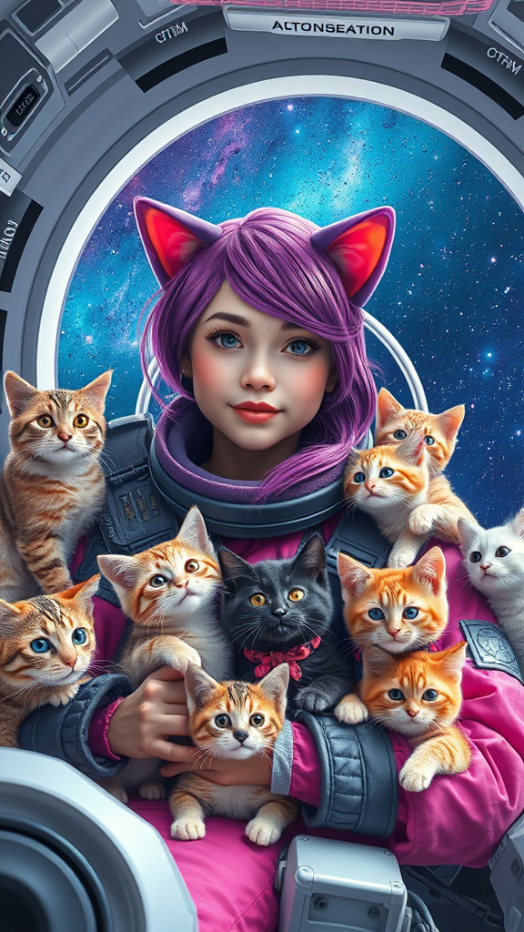 A mesmerizing young woman with vibrant purple hair is enveloped by a delightful array of cats of differing colors and sizes, all aboard a space station. She wears an adorable pink and purple space suit, while the cats are clad in tiny astronaut suits. The vast expanse of space stretches beyond, dotted with countless stars and swirling galaxies. The scene captures the sleek, modern aesthetics of the space station with visible mechanical elements. This whimsical, futuristic tableau depicts the girl and her feline companions joyfully exploring the cosmos. The scene is rendered in stunning 8k resolution, with radiant, cinematic lighting akin to a 35mm f1.4 shot on Fuji color film for breathtaking realism.