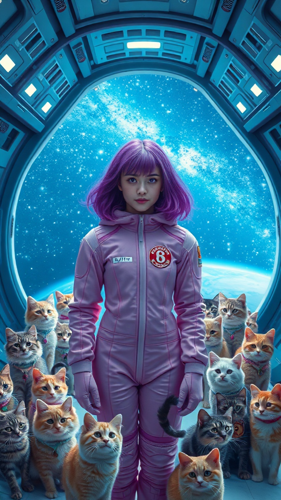 A mesmerizing young woman with vibrant purple hair stands in the center of a sleek, modern space station, surrounded by an array of cats of every color and size, each clad in charming little astronaut suits. She wears an adorable pink and purple space suit that complements her hair. Beyond the large, transparent windows lie the breathtaking vastness of space, filled with countless shimmering stars and swirling galaxies. Mechanical components hum quietly in the background of this whimsical and futuristic scene, as the girl and her feline companions embark on their cosmic exploration. Soft, cinematic lighting casts a radiant glow, highlighting the surreal beauty of the setting captured with the rich, vivid tones of Fuji color film.