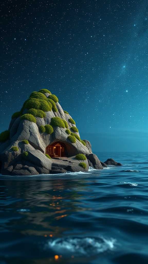 A mesmerizingly detailed 3D render set in 8k showcases a serene sea beneath a star-studded night sky, featuring a moss-covered, intricately designed low poly rock. The scene is illuminated with cozy indoor lighting, blending cinematic influences from Mark Ryden, Pixar, and Hayao Miyazaki. In a close-up, the cinematic lighting highlights an array of fine details, establishing a dreamcore atmosphere. This hyper-realistic piece is trending on ArtStation and manifests in 4k, with a focus on extreme, ultra-realistic detail. Utilizing Unreal Engine 5 and ultra-high detail quality, it incorporates overcast reflection mapping and movie-quality VFX post-production. Dramatic shadows interplay with RTX ray tracing, and 8K post-processing adds to its hyper-realism. The rendering style combines Redshift and Octane techniques to perfect this unbelievably detailed vision.