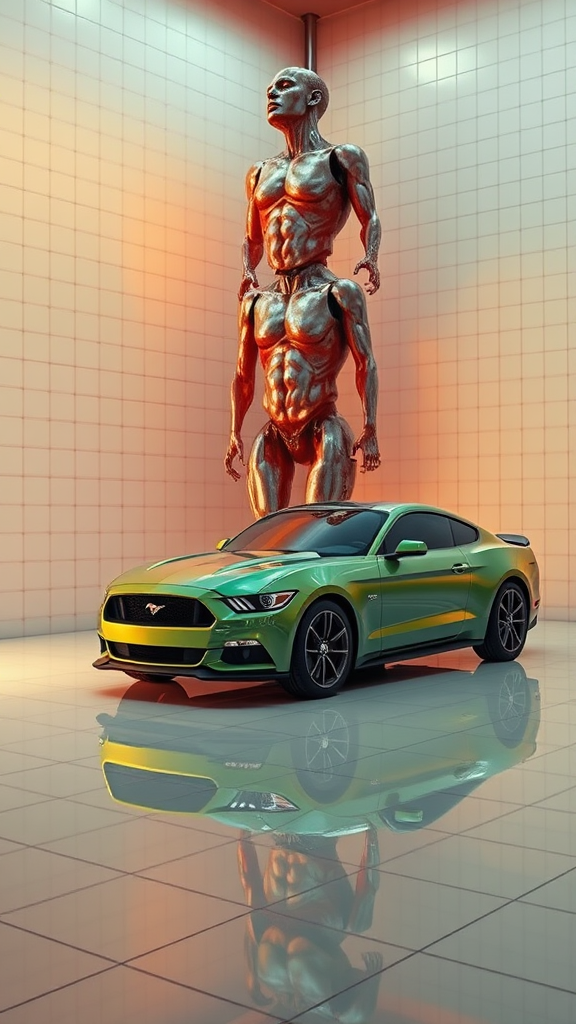 A metallic green Ford Mustang in an all-white tiled room, illuminated by bright lighting, radiating a perfect orange glow. The scene is enriched with pastel colors, showcasing ultra-realistic and insanely detailed professional commercial photography. The setting presents a surreal and distorted sculpture of stacked torsos echoing a totem pole design with intentional poor anatomy, featuring extra limbs and floating, disconnected limbs that blur the lines of reality. This mutated and bizarre display stands out with its disturbing yet captivating details, evoking a sense of mutation and amputation, enhanced by expert color grading.