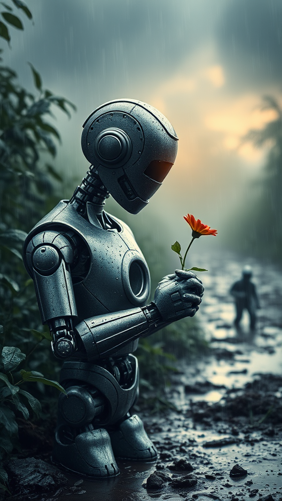 A metallic robot amidst a lush, rain-soaked landscape, clutching a delicate flower with tenderness. Cinematic lighting casts ethereal, volumetric rays that cut through the misty atmosphere, highlighting droplets of water trickling down its weathered surface. The scene is alive with a moody ambiance, where the wet earth glistens with a sheen of fresh rain, scattered mud patches add texture to the ground, and the air feels heavy yet serene under a soft, dramatic sky.