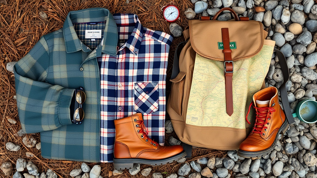 A meticulously arranged display of 1960s style camping wear, showcasing neatly organized vintage outdoor attire and accessories displayed in a photorealistic setting; a retro-patterned windbreaker folded precisely next to a classic plaid flannel, rugged leather hiking boots with red laces aligned perfectly alongside a weathered canvas backpack, iconic round sunglasses and a worn map placed with precision, a vintage compass and enamel camping mug completing the timeless adventure scene against a backdrop of pine needles and pebbles.