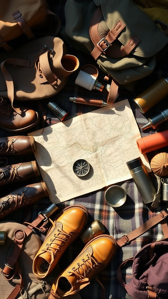 A meticulously arranged flat lay of vintage 1960s camping gear, featuring classic canvas backpacks, rugged leather boots, plaid woolen blankets, retro thermos flasks, and tin cups, all in earthy tones; among them, a worn map and a compass evoke adventure, sunlight casting soft shadows to enhance texture and detail.
