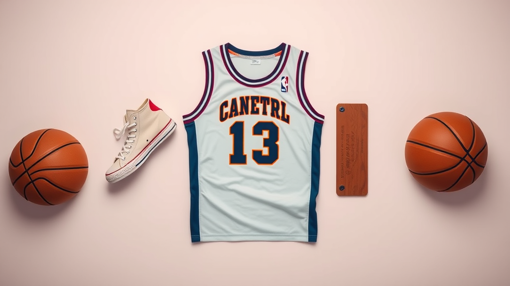 A meticulously arranged flat lay photograph of a retro basketball ensemble, featuring a classic jersey, high-top sneakers, and a leather basketball, all displayed neatly in a symmetrical pattern. The setting is bathed in a Wes Anderson-inspired color palette, with soft pastel hues and a touch of retro charm, under controlled studio lighting that creates a gentle, low-contrast atmosphere. The image is captured in stunning 8k resolution, highlighting the textures and vintage details, with an aspect ratio of 4:5 and a subtle artistic flair.