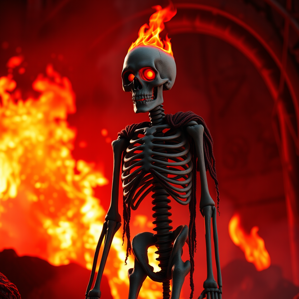 A meticulously crafted 3D portrait of a ghoul standing guard at the fiery gates of Hell. The creature features a burning skull with glowing crimson eyes, its slender and tall form a highly detailed skeleton draped in tattered rags. Flames roar and dance in the background, casting an infernal glow that enhances the dark fantasy horror atmosphere. The scene is lit dramatically and cinematically with deep reds, creating a powerful contrast against the ghoul's bleached bones. The soft-focus approach enhances the supernatural mist enveloping the setting, captured in a cinematic style reminiscent of high-quality illustrations on platforms like ArtStation.
