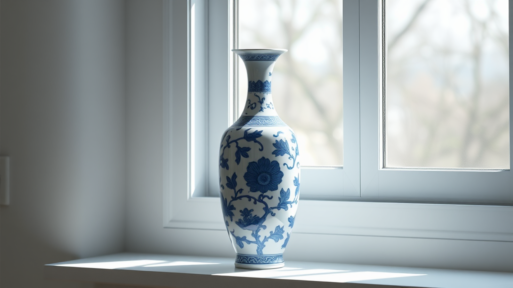 A meticulously crafted Chinese blue and white porcelain vase with an elegantly elongated neck, positioned gracefully on a window sill, bathed in soft studio lighting. The scene, reminiscent of a Christian Hilfgott Brand 3D render, showcases precisionism with its sharp, clean lines and vibrant colors. The vase's intricate patterns reflect timeless artistry, while the lighting casts delicate shadows, enhancing its striking beauty, all captured in a cinematic 16:9 ratio.