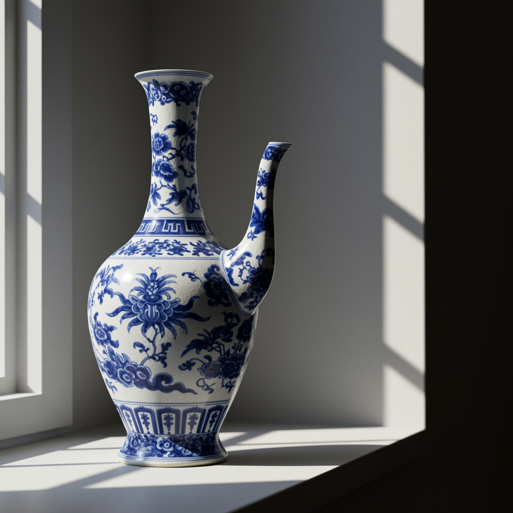 A meticulously crafted Chinese blue and white porcelain vase with an elegant long neck, resting on a windowsill bathed in soft natural light, its intricate patterns reminiscent of ancient artistry, a 3D render inspired by Christian Hilfgott Brand, showcased in a digital art gallery, precisionism style, enhanced by provia tones, under the clear illumination of studio lighting, captured in a wide 16:9 aspect ratio.