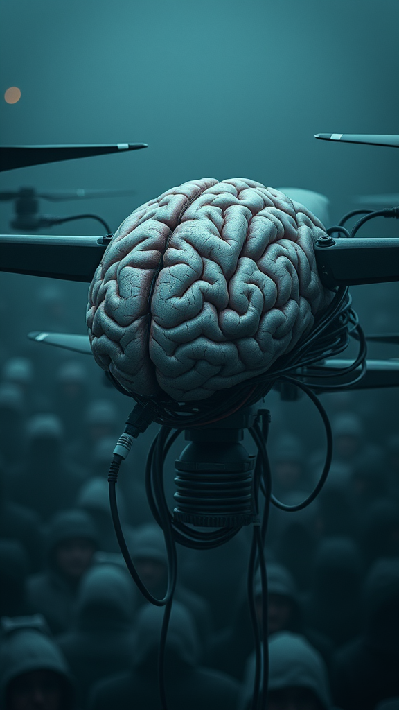 A meticulously crafted human brain, seamlessly integrated into the mechanical and organic form of a drone, adorned with intricate wires and connected to electronic cables, scenes reminiscent of visionary films, depicted in the style of dark muted tones of deep blue and grey, evoking a frostpunk aesthetic, captured with a Samyang AF 14mm f/2.8 RF lens and Nikon D850, featuring detailed, layered compositions and narrative diptychs, portraying densely packed crowd scenes with the feel of a Kodak Ektachrome photograph, utilizing dramatic lighting and moody color schemes to enhance a gloomy, foggy atmosphere, infused with a sense of eerie serenity amidst chaos.