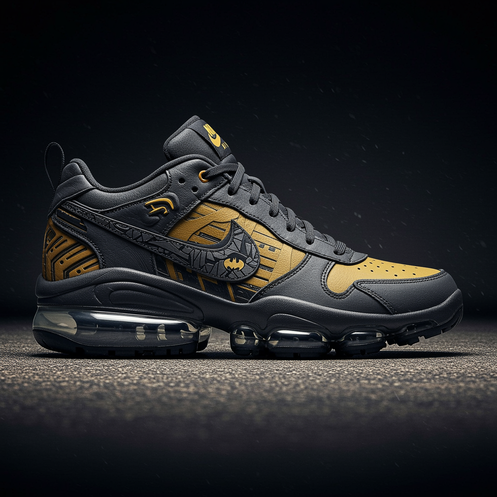 A meticulously crafted Nike sneaker design drawing inspiration from the intricacies of Batman's aesthetic, infused with subtle creative twists. The design is rendered in breathtaking 8K resolution, showcasing every detail for a captivating experience. Set in a 4:5 aspect ratio to elevate visual allure. #SneakerDesign #Nike #BatmanInspired