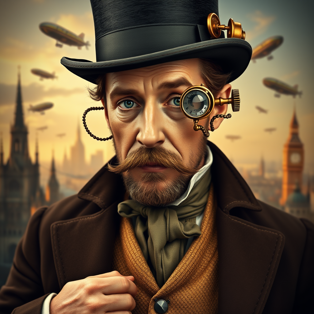A meticulously crafted steampunk portrait of Phileas Fogg, showcasing a gentleman of refined elegance and stoic determination. He is adorned in Victorian-era attire, complete with a tailored waistcoat, pocket watch, and cravat. His top hat features tiny cogs and gears subtly woven into the fabric, hinting at his adventurous spirit. A monocle with a delicate brass frame enhances one eye, connected to a series of intricate tubes that hint at advanced optical capabilities. His gaze is focused and contemplative, set against a backdrop of softly glowing airships and a clockwork city skyline, suggesting a world of endless possibilities and mechanical marvels.