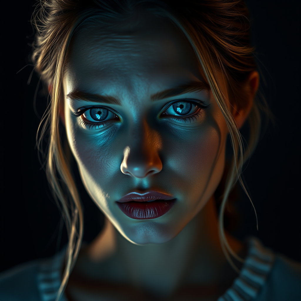 A meticulously crafted studio full body portrait of a young woman with captivating ice-blue eyes, captured in exquisite detail, under artfully dim lighting. The ultra-realistic, hyper-detailed photo is reminiscent of a collaboration between photographers Irving Penn and Annie Leibovitz, with expert retouching akin to Pratik Naik's touch. Shot on a Leica SL2 using an f/5.6 aperture and a 105mm lens, the image embodies a seamless blend of technical precision and artistic expression, capturing an ethereal and sophisticated essence.