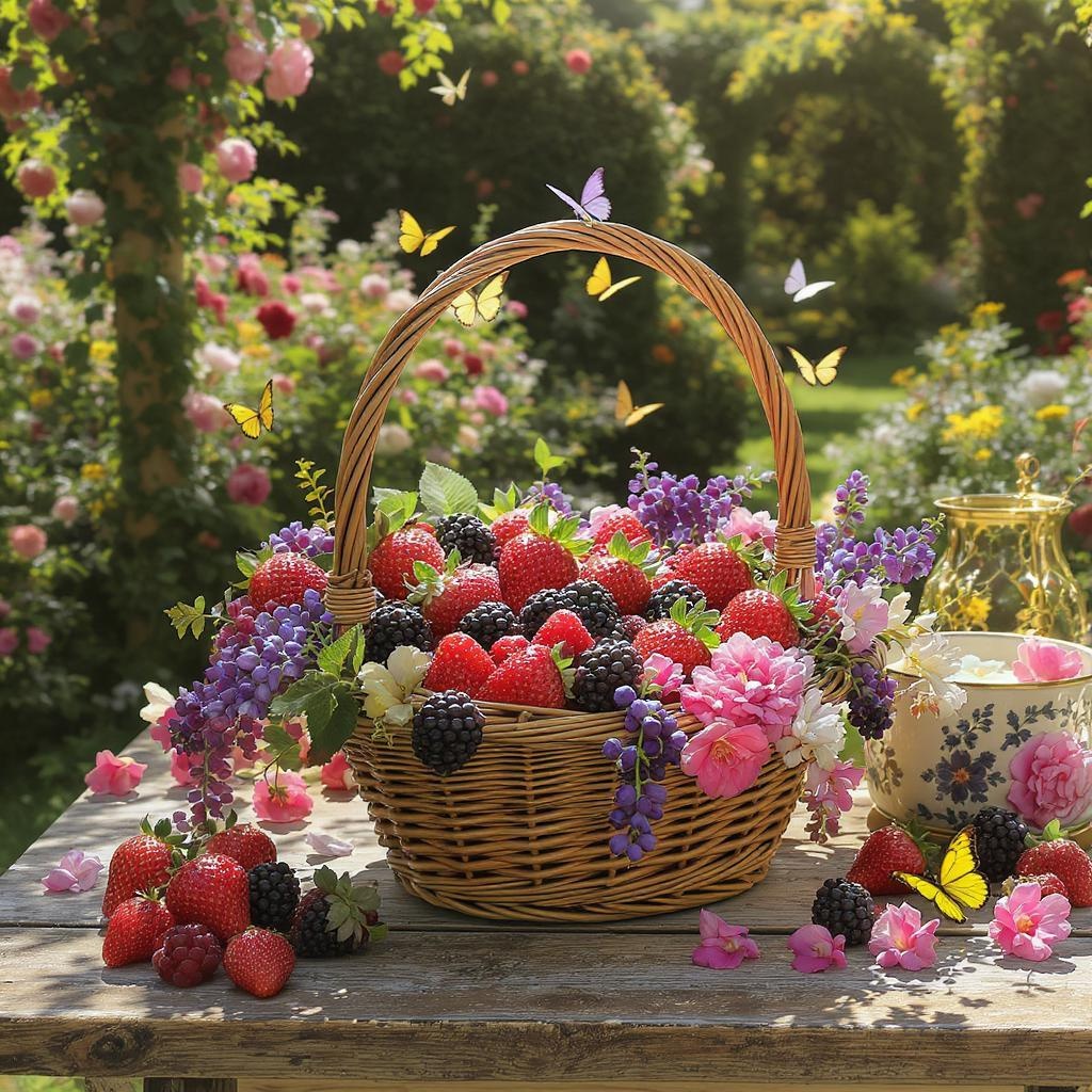 A meticulously detailed basket of an assortment of berries including plump strawberries, luscious blackberries, and tart cranberries, arranged artfully on a rustic wooden table in a sun-dappled garden. The scene is set against the backdrop of a lavish Victorian garden, where blooming roses and ivy-covered trellises create an enchanting atmosphere. The vibrant colors of the ripe berries gleam in the gentle sunlight, casting soft shadows across the table, while butterflies flutter gently in the warm summer air.