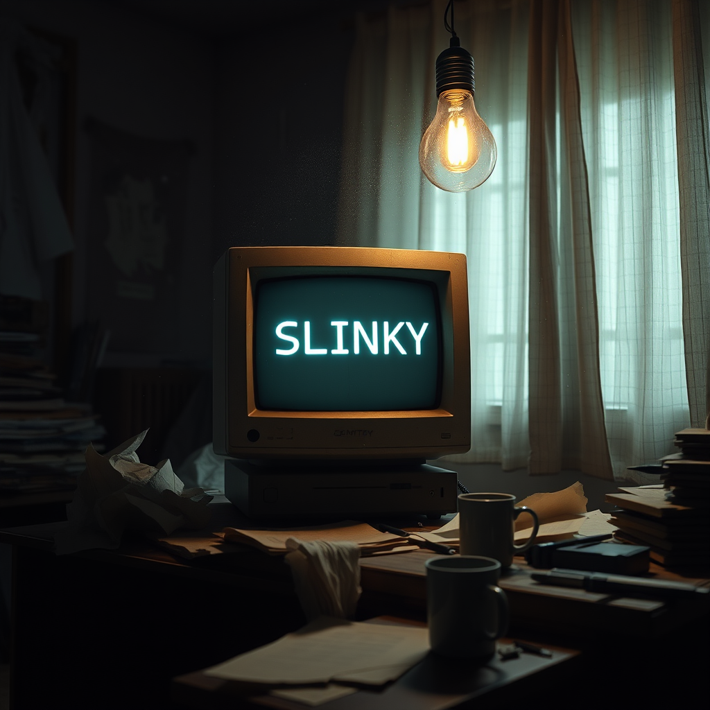 A meticulously detailed cinematic render captures an old, dusty CRT monitor perched on a cluttered wooden desk in a dimly lit, messy room. The screen emits a soft glow with the letters "SLINKY" prominently displayed. The monitor, with its worn textures and faint scratches, is surrounded by an assortment of items, including crumpled papers, scattered pens, and an abandoned coffee cup, adding to the room's chaotic ambiance. Dust particles float through the air, illuminated by the faint light filtering through a tattered curtain. Shadows cast by an overhead light bulb create a moody atmosphere, highlighting the neglected and nostalgic feel of the scene.