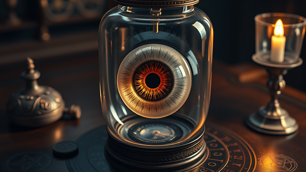 A meticulously detailed human eye suspended within an ornate glass jar, inspired by the artistic styles of Peter Mohrbacher and Greg Rutkowski, exhibiting intricate patterns on the iris and glass surface, in stunning 8k ultra-high-definition. The scene is rendered with photorealistic precision using Redshift, capturing exquisite reflections and refractions in a dramatic play of light and shadow. The jar rests on an elegant wooden table, surrounded by subtle, mysterious alchemical symbols, hinting at a story beyond the image. 16:9 aspect ratio, with vibrant colors and rich textures enhancing the overall atmosphere.