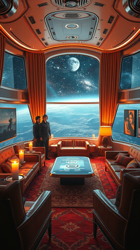 A meticulously detailed hyper-real retrofuture interior of a spaceship's living room features a holographic display at its center, surrounded by an eclectic mix of mid-century modern furniture and vibrant textiles. The warm ambient lighting includes flickering LED candles, which cast gentle shadows against the walls adorned with abstract paintings. Luxurious drapes frame large panoramic windows offering breathtaking vistas of the cosmos, with scattered stars and swirling galaxies visible beyond. A subtle lens flare adds depth to the scene, enhancing its retrofuturepunk aesthetic. The room captures the essence of a 1960s vision of the future, rendered in stunning 4k quality to showcase every intricate detail, from the polished metal surfaces to the soft upholstery, creating an immersive, nostalgic atmosphere with a futuristic twist.