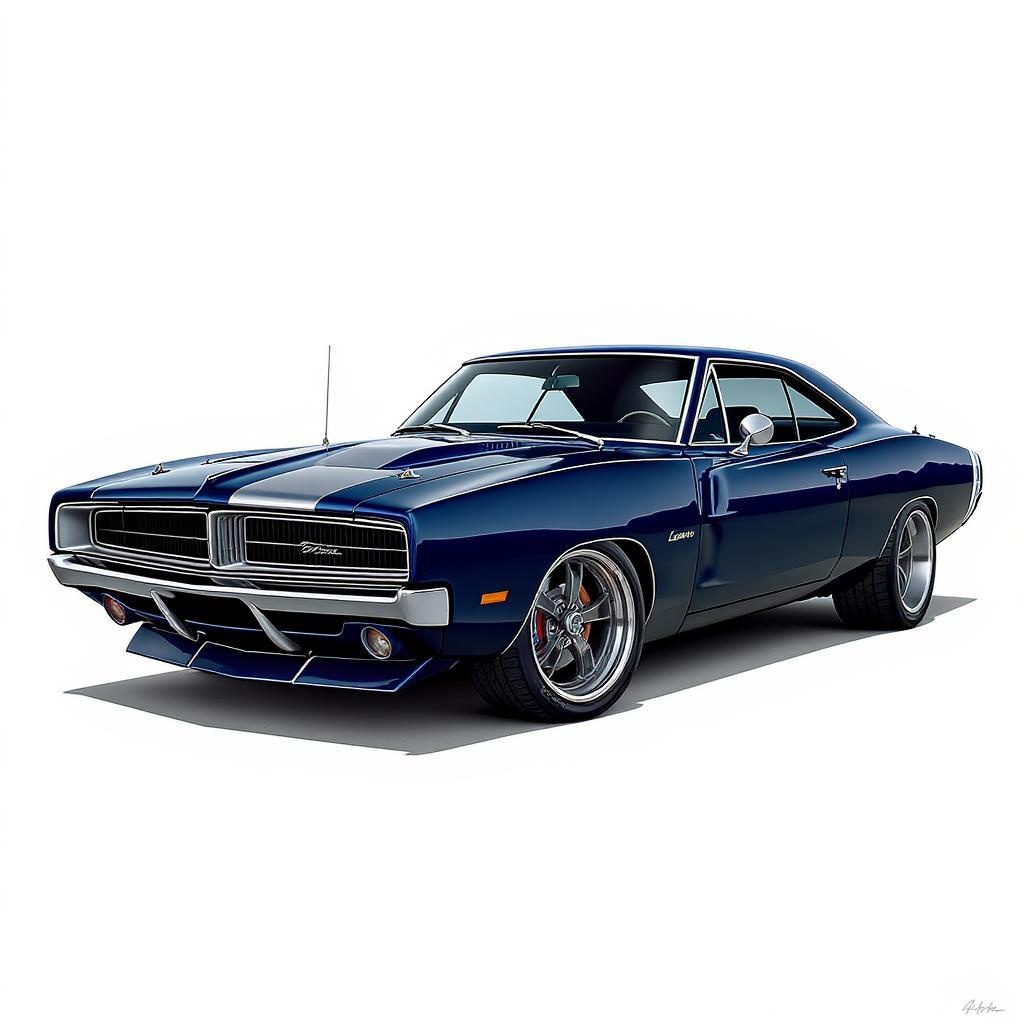 A meticulously detailed illustration of a classic 1969 Dodge Charger, capturing its iconic aggressive front grille and robust presence. The deep midnight blue body gleams under an imagined light, while contrasting silver racing stripes add a modern twist. The car's powerful stance is accentuated by slightly larger wheels, giving it an even more commanding presence. The windows are slightly tinted, adding a touch of mystery to the classic silhouette, all set against a pristine white backdrop.
