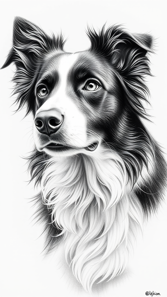 A meticulously detailed pencil sketch of a border collie dog portrait, set in sharp focus and capturing a studio photo essence, the intricate details and textures mimicking the depth seen in high-resolution images. The composition reflects the style of renowned artists, with subtle artistic flourishes, including gentle cross-hatching and delicate shading to emphasize the dog's intelligent eyes and expressive features, giving it a lifelike presence that resonates with the artistry found on platforms like ArtStation.