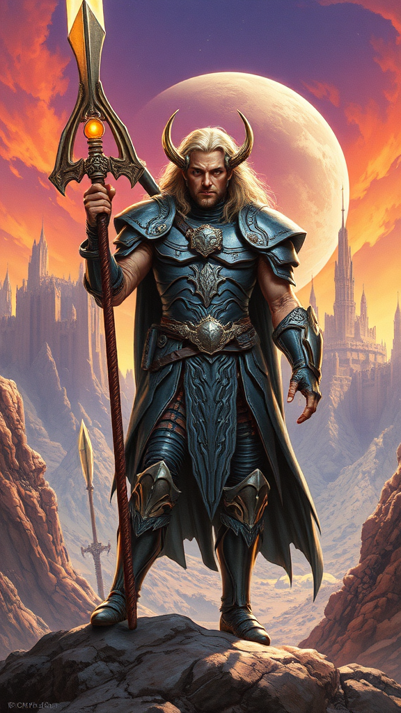 A meticulously detailed portrayal draws inspiration from the distinctive styles of Raphael Kirchner, Moebius, and Sergio Toppi, capturing Colwyn, the intrepid hero from the film 'Krull.' Clad in his iconic, intricately designed armor, Colwyn wields the magical Glaive weapon with an air of unyielding resolve. He stands prominently against the alien landscape of the planet Krull, framed by its rugged, craggy terrains and imposing castle formations. The scene is imbued with a sense of adventure and peril, reflecting the hero's courage and the exotic beauty of Krull. Rendered in a cinematic poster art style, the composition features sharp, dynamic lines and a striking play of lights and shadows reminiscent of '80s high fantasy movie posters. The hyperrealistic image is enhanced by a vibrant interplay of light and shadow, with slight creative modifications that maintain the essence of the core concept.