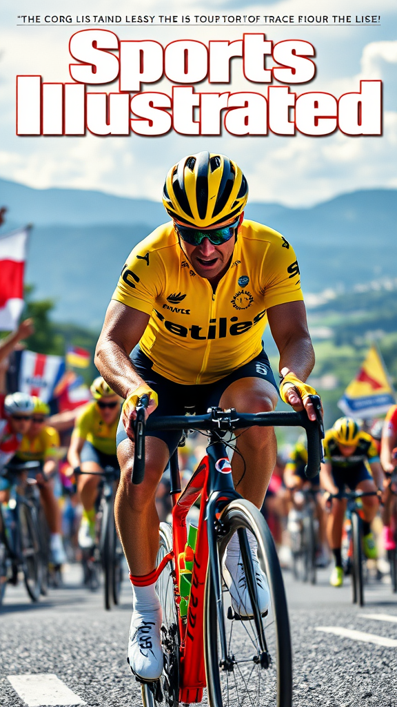 A meticulously detailed portrayal of a Sports Illustrated cover photo capturing the essence of the Tour de France, featuring a cyclist in the iconic Yellow Jersey, exuding the spirit of intense athletic competition in a photorealistic manner, with a focus on dynamic motion and determination, set against a backdrop of cheering crowds and scenic landscapes, infused with vibrant colors and a touch of artistic flair for heightened drama and energy.