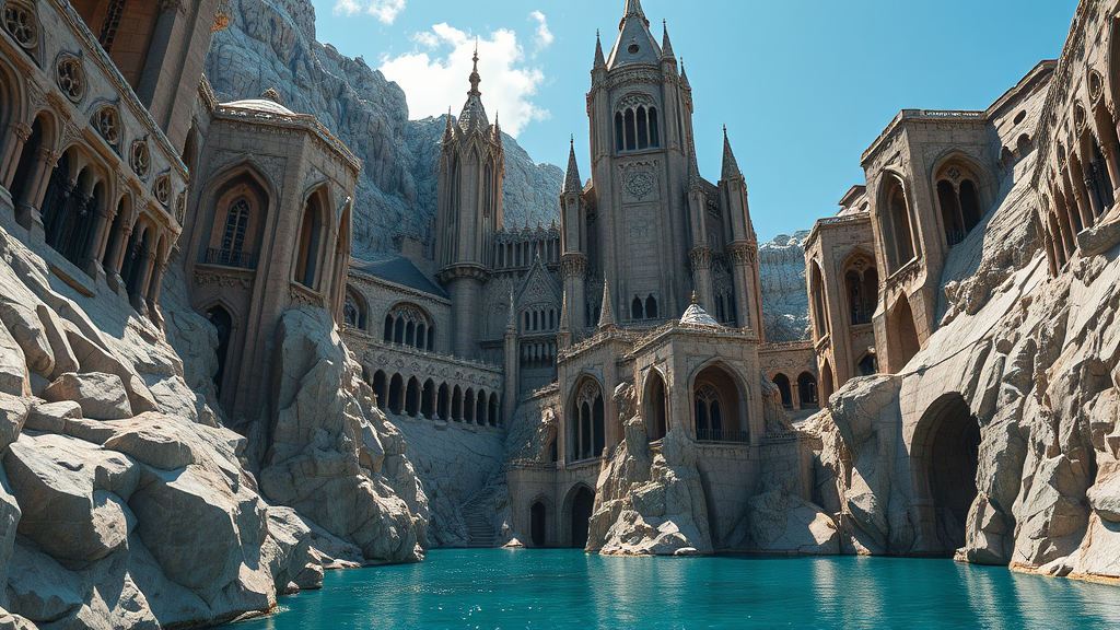 A meticulously detailed sculpted castle with towering stone walls rises majestically in the rugged rocky mountains, embodying a unique blend of gothic futurism with influences from Eve Ventrue and Filip Hodas. The architecture presents a harmonious dance of structured chaos, with intricate designs and spires reaching towards the heavens. Below, a shimmering passage gracefully curves over a serene body of water, mirroring the brilliant blue skies above. Each element is exquisitely crafted, offering elaborate detail that captivates the imagination, creating a surreal yet realistic vision of a fortress that stands as a testament to both the past and the future.
