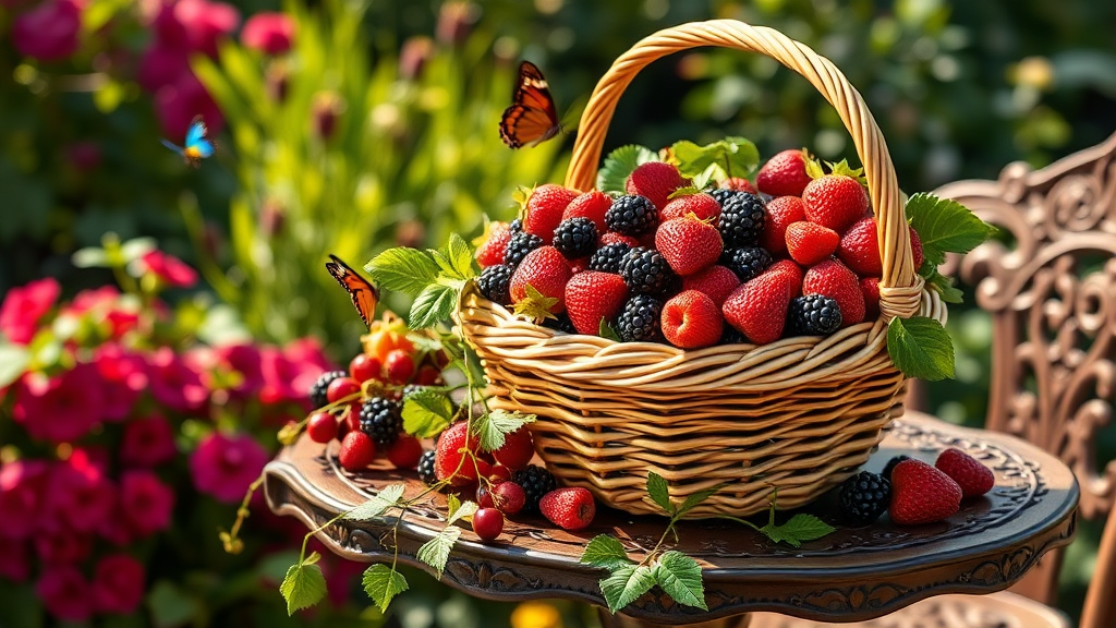 A meticulously detailed Victorian basket overflowing with ripe strawberries, plump blackberries, and tart cranberries, nestled on an intricately carved garden table, set against a lush Victorian garden backdrop. The scene is bathed in warm sunlight, highlighting the vibrant colors of the fruit and the rich textures of the basket. Delicate tendrils of ivy wend their way around the table legs, while a pair of colorful butterflies flit nearby, adding a touch of life to this serene and picturesque scene.