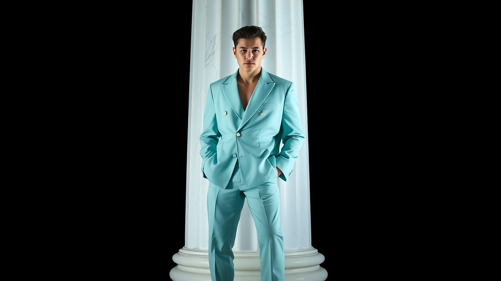 "a meticulously lit fashion portrait of dashing gentleman posed beside a sleek column, sculpted in luminous white marble, wearing an air-filled aquamarine bubble jumpsuit by kei ninomiya for ISAMU, layered over a debonair balenciaga blazer and restricted trousers, situated against a refined black background, illuminated with a sharp focus and cinematic grandeur, exuding contained elegance and untamed sophistication in symmetrical repose, a masterpiece of glamour and refinement, fit for the pages of a high-end fashion magazine"