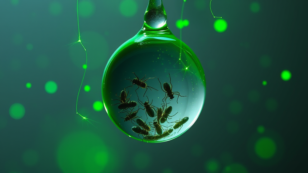 A microscopic photograph capturing mites encased within a shimmering droplet of water, surrounded by radiant green sparks descending from above, set against a gradient backdrop. The vividly shining sparks emit a lush green luminescence, enhanced by a shallow depth of field and enveloping volumetric lighting. The scene is cinematic with intricate, ultra-realistic details and a touch of ethereal chaos, inviting a sense of wonder and curiosity.