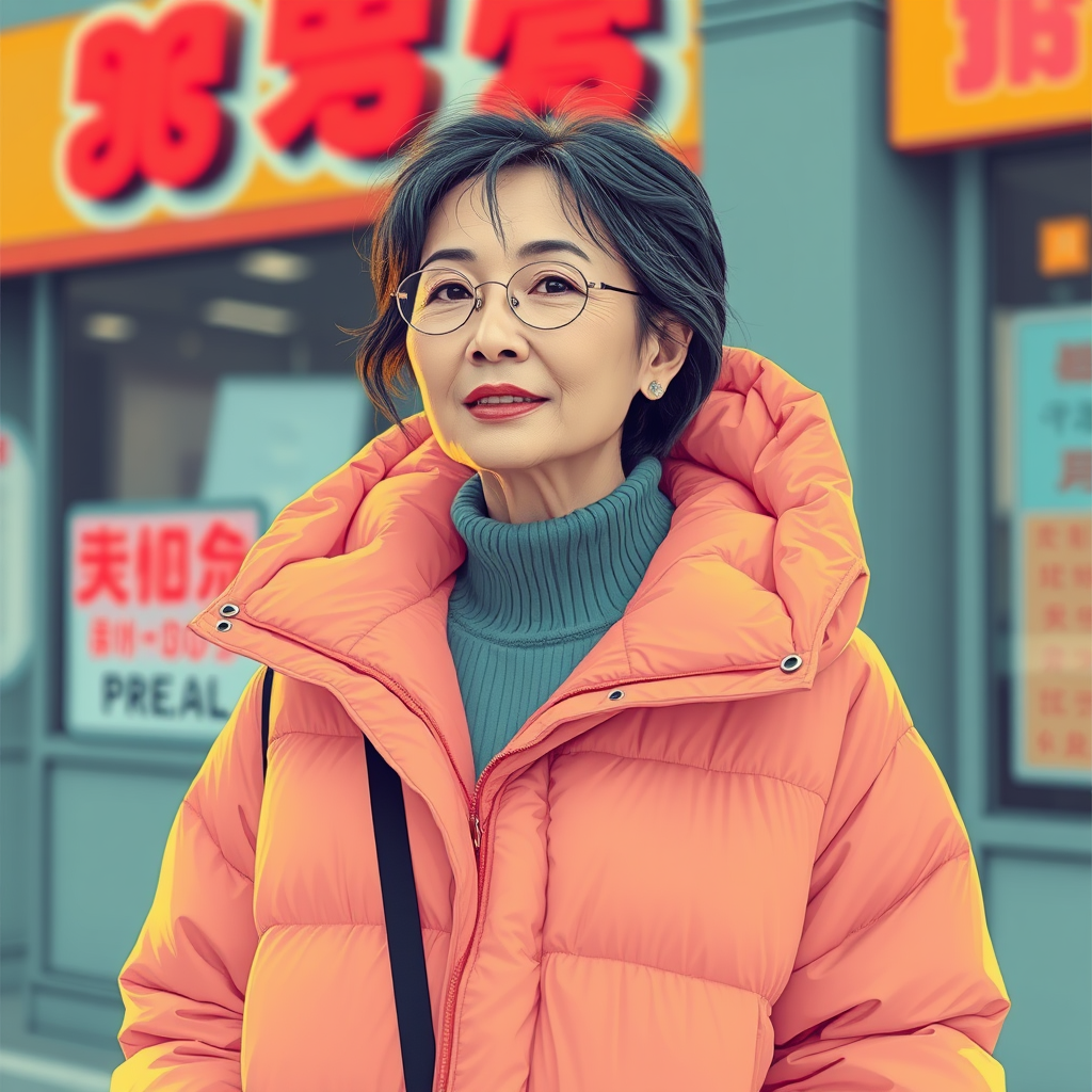 A mid-aged woman donning a poncho-like oversized puffer jacket, infused with Off-White flair, echoing the aesthetic of tumblr, and Yanjun Cheng's stylistic touch. Set in a digital art style reminiscent of the lofi girl internet meme, trending on platforms like Dezeen. This catalog-esque image bears the influence of artists like Rhads and Lois van Baarle, featuring a palette of bright pastel colors. The visual concept evokes a retro vibe, incorporating elements of a Korean pop culture star. The woman emanates a sense of nostalgia and contemporary fashion blend, all while exuding a unique individuality.