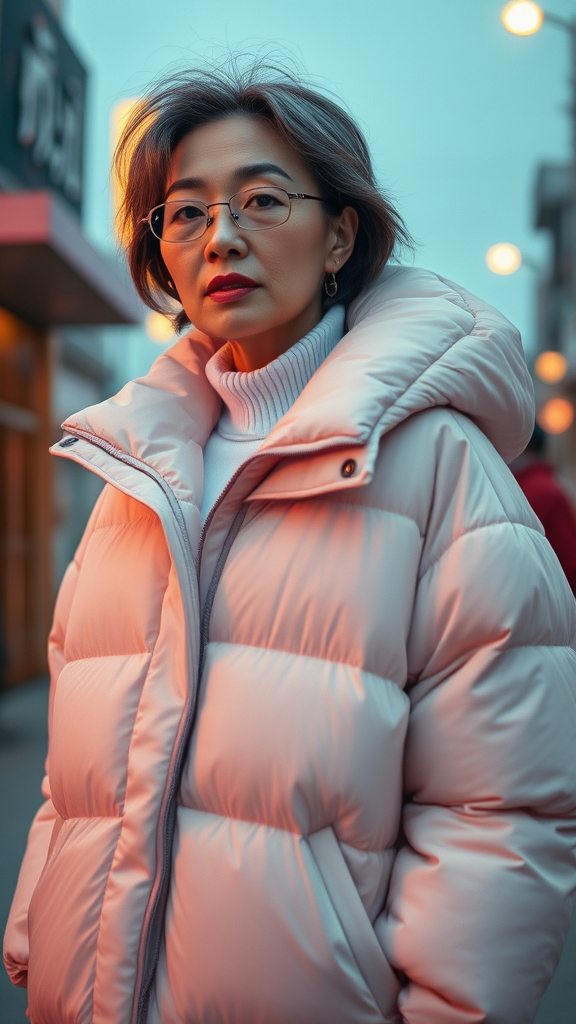 A mid-aged woman in a poncho-style oversized puffer jacket, blending elements of Off-White fashion with the aesthetic of Tumblr and Yanjun Cheng's art style. The scene captures the essence of digital art and echoes the vibe of the lofi girl internet meme. It presents a catalog photo feel that could be trending on Dezeen. The piece is influenced by the works of Rhads and Lois van Baarle, incorporating bright pastel colors. The woman's style reflects a retro vibe, with an emphasis on a modern, fashion-forward look, inspired by eclectic internet culture and artistic trends, featuring an Asian fashion flair.
