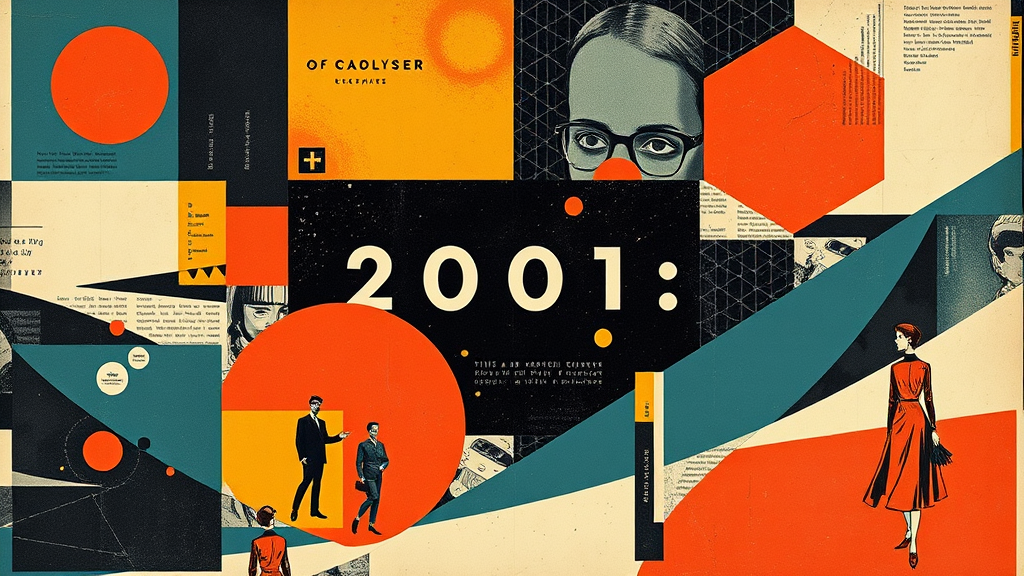 A mid-century modern collage blending abstract shapes and patterns from vintage fashion and science magazines with textbook illustrations, reimagining the iconic 2001: A Space Odyssey film poster. The design features bold geometric forms and vibrant, retro colors, juxtaposed with snippets of futuristic technology and classic styles, capturing the essence of space exploration and timeless elegance in a harmonious visual narrative, set in a 3:4 aspect ratio.