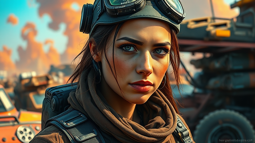 A mid-distance portrait of a woman in a rugged survival outfit, equipped with various gear, set against a sci-fi junkyard backdrop. The scene is captured in an intricately detailed digital painting, highlighting the character’s symmetrical and realistic face. The composition utilizes a 2/3 face angle with side lighting that adds drama and depth to the vivid, colorful background. The design embodies concept art qualities, focusing on hyper-realistic and finely detailed elements. The woman’s face reflects determination, with features and gear meticulously rendered to convey a sense of resilience in a futuristic world.