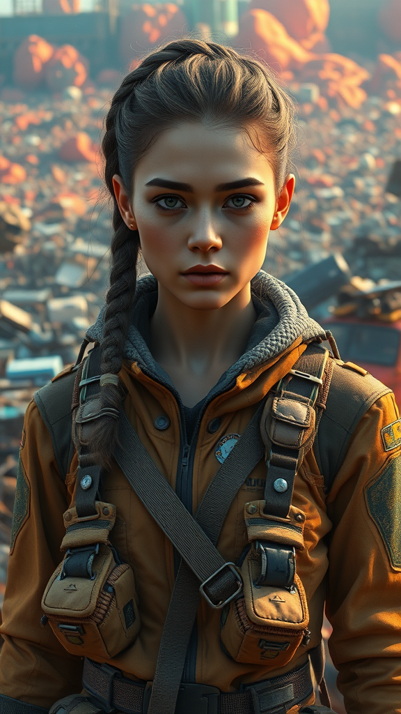 A mid-distance portrait of a woman in a survival outfit, adorned with numerous pieces of gear, stands against a backdrop of a sprawling junkyard. This scene embodies science fiction elements, captured in an intricate digital painting where her symmetrical face is detailed and realistic. The character design shines with concept art precision, utilizing Unreal Engine 5's capabilities to deliver an 8k hyperrealistic image. The splash art style is evident, with a 2/3 face angle and dramatic, colorful background illuminated by side lighting. Her expression reveals resilience, emphasized by the texture and color depth of her environment. Her face is framed by a crown braid, adding a touch of elegance to her rugged appearance, while the intricately detailed outfit displays practicality for survival. The scene is rich with vivid colors and dynamic lighting, creating an absorbing atmosphere that speaks volumes of her character's narrative.