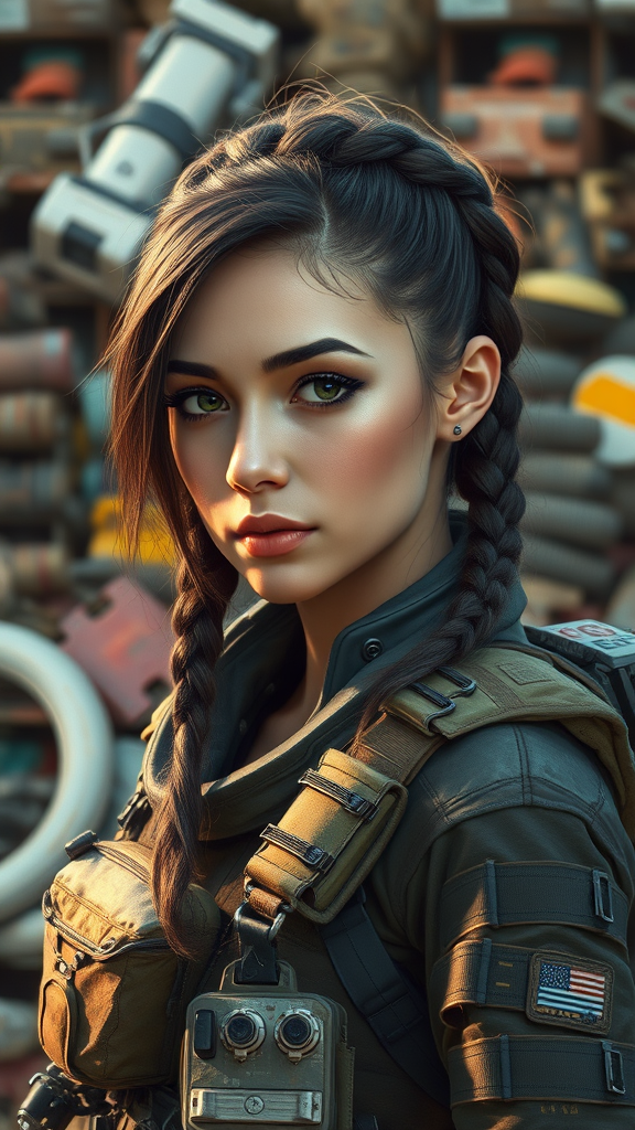 A mid-distance portrait of a woman wearing a detailed survival outfit with an array of gear, set against a junkyard background in a science fiction setting. The artwork features intricate digital painting focusing on character portrait and design, with a symmetrical, realistic face depiction in high resolution. The concept art presents a hyperrealistic splash art style, showcasing a mid-shot view with richly detailed surfaces, dramatic lighting, and vibrant color depth. Her face is turned at a 2/3 angle, with side lighting accentuating her features. Background is colorful, offering a contrast to her rugged attire. Her crown braid adds complexity to her design, enhancing the overall aesthetic. The scene captures a sense of adventure and resilience in a futuristic, imaginative world.