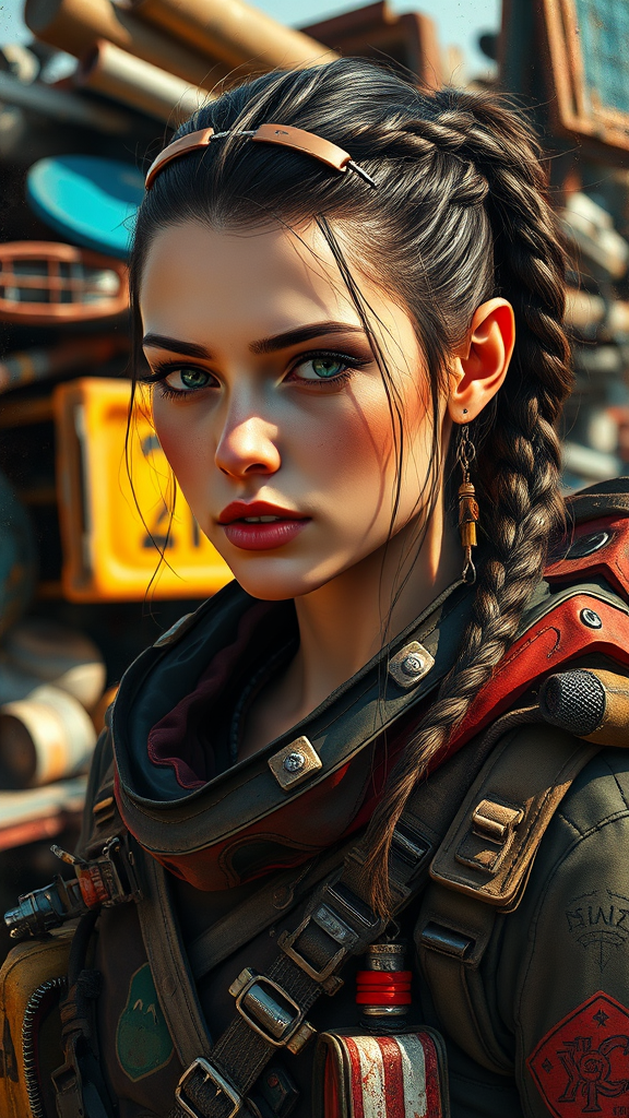 A mid-distance portrait of a woman wearing a detailed survival outfit with a lot of gear, set against a junkyard backdrop. The scene is infused with science fiction elements, showcasing an intricately designed character in a digital painting style. The character's symmetrical face is realistic and meticulously detailed, captured in 8k resolution with dramatic side lighting. The colorful background adds depth, with the 2/3 face angle emphasizing her features. Her appearance is hyperrealistic, enriched with the vibrancy and drama of splash art. The woman sports a crown braid, exuding a gritty yet resilient demeanor fit for a post-apocalyptic world. Scribbles and imperfections suggest a rough sketch quality, while minor creative twists such as bold color choices and exaggerated shadows add an artistic edge.