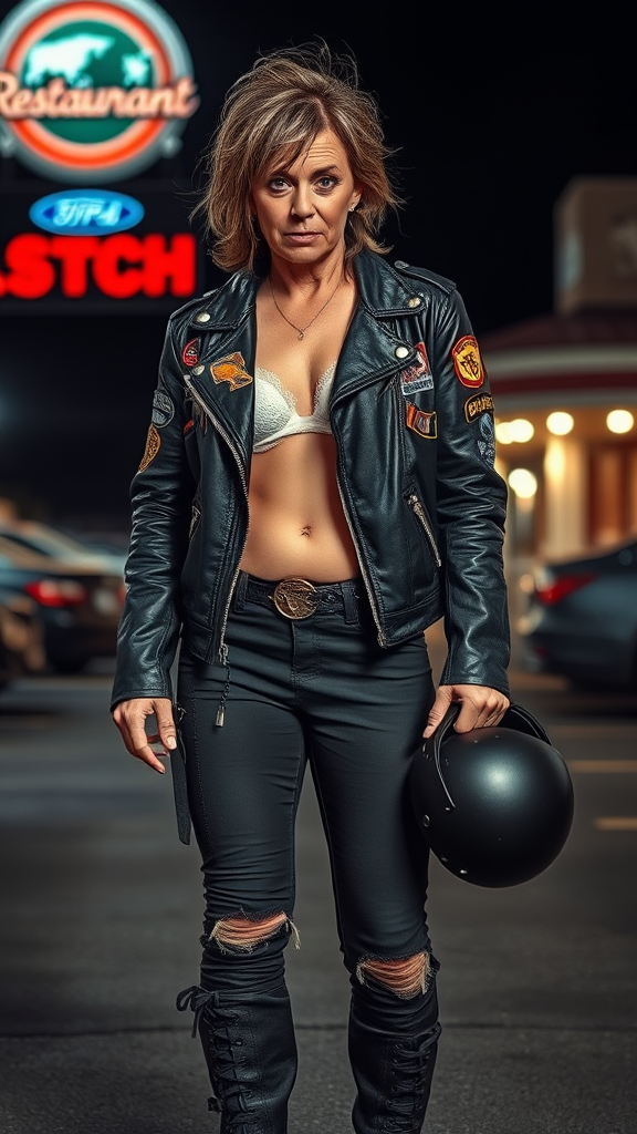 A middle-aged British woman exuding a punk, rebellious vibe stands with a bored expression. Her messy hair complements the worn-out black leather jacket adorned with various patches. Her rugged trousers and scuffed combat boots add to her unapologetic look. The edge of a white lace bra peeks out, hinting at her bold style. She casually holds a black motorcycle helmet by her side. In the background, a dimly lit restaurant parking lot paints the scene with a sense of gritty urban life.