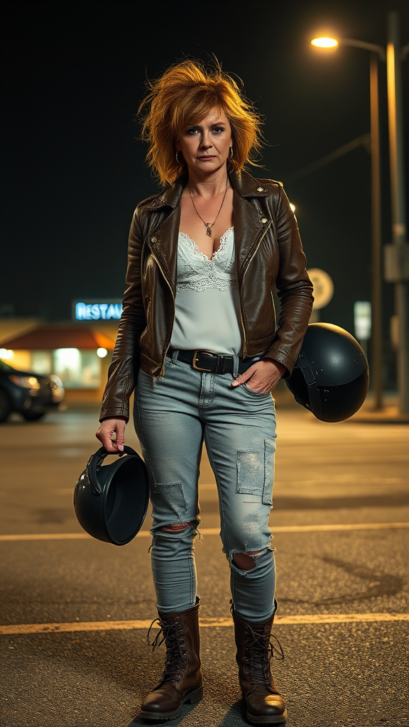 A middle-aged British woman with a punk and defiant vibe stands confidently in a dimly lit restaurant parking lot. Her messy, unkempt hair frames her face, emphasizing her bored yet intense expression. She's clad in a well-worn leather jacket over a white lace camisole, paired with rugged, faded trousers and scuffed combat boots. In one hand, she casually holds a black motorcycle helmet, suggesting a rebellious spirit. The dim streetlights cast long shadows behind her, enhancing the gritty atmosphere of the scene.